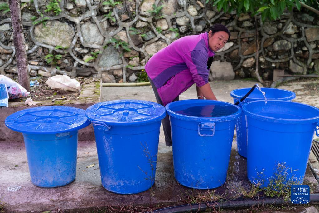 9月7日,在雅安市石棉縣王崗坪彝族藏族鄉(xiāng)幸福村二組,一名村民在接山泉水,這股山泉水是村民們從山上引下來的。新華社記者 才揚(yáng) 攝