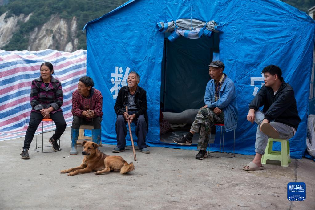 9月7日,在雅安市石棉縣王崗坪彝族藏族鄉(xiāng)幸福村二組,村民們在帳篷外休息。新華社記者 才揚(yáng) 攝