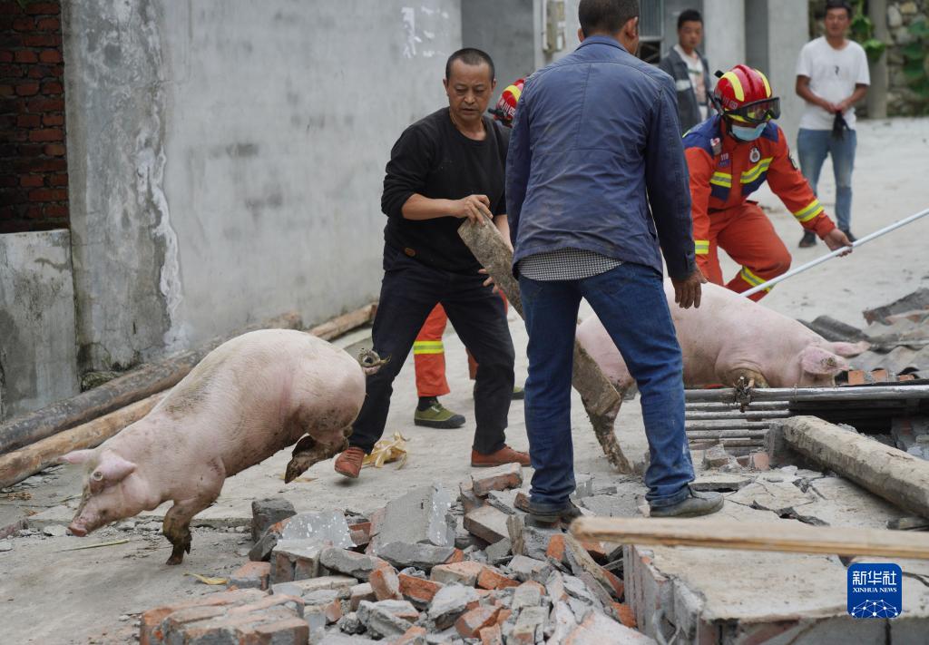 9月7日,在雅安市石棉縣王崗坪彝族藏族鄉(xiāng)幸福村二組,消防救援隊(duì)員協(xié)助村民從倒塌的豬圈中轉(zhuǎn)移豬。新華社記者 才揚(yáng) 攝