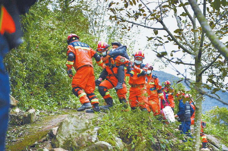 救援隊(duì)員協(xié)助紫雅場村最后一批村民下山,他們隨后將通過水路轉(zhuǎn)移至設(shè)在得妥鎮(zhèn)場鎮(zhèn)的受災(zāi)群眾安置點(diǎn)。 四川日報全媒體記者 楊樹 攝
