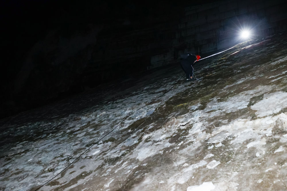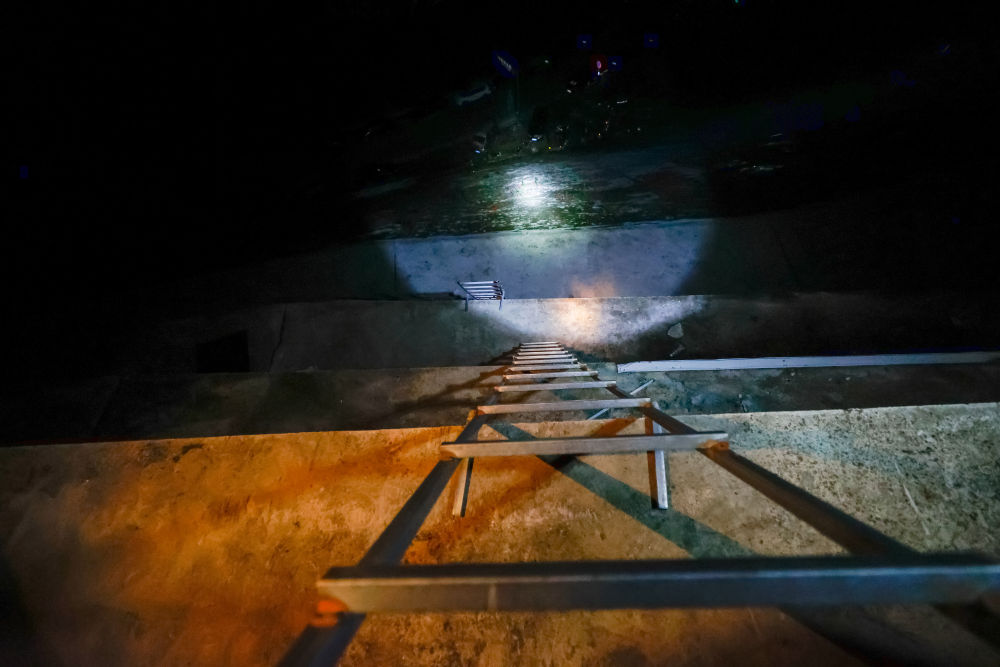 本以為沿著這條公路就可以走到得妥,轉過幾道彎,前面道路中斷完全無法通行,李祥帶我們到了真正可以下山的地方。這是一片分為好幾層的幾乎垂直的水泥邊坡,即便是應急電筒的強光,也照不亮它的底。每層邊坡之間有鋼梯連接,我們要順著鋼梯爬下去,“山下會有車來接我們”,李祥淡定地說。