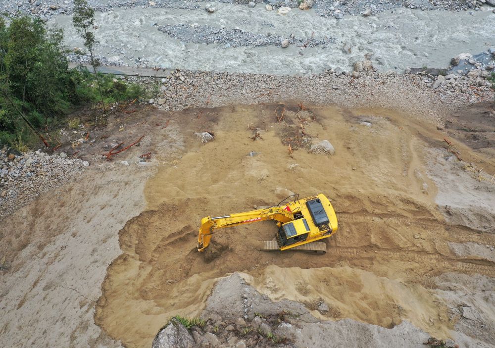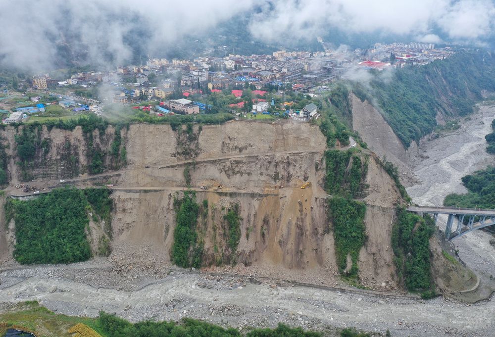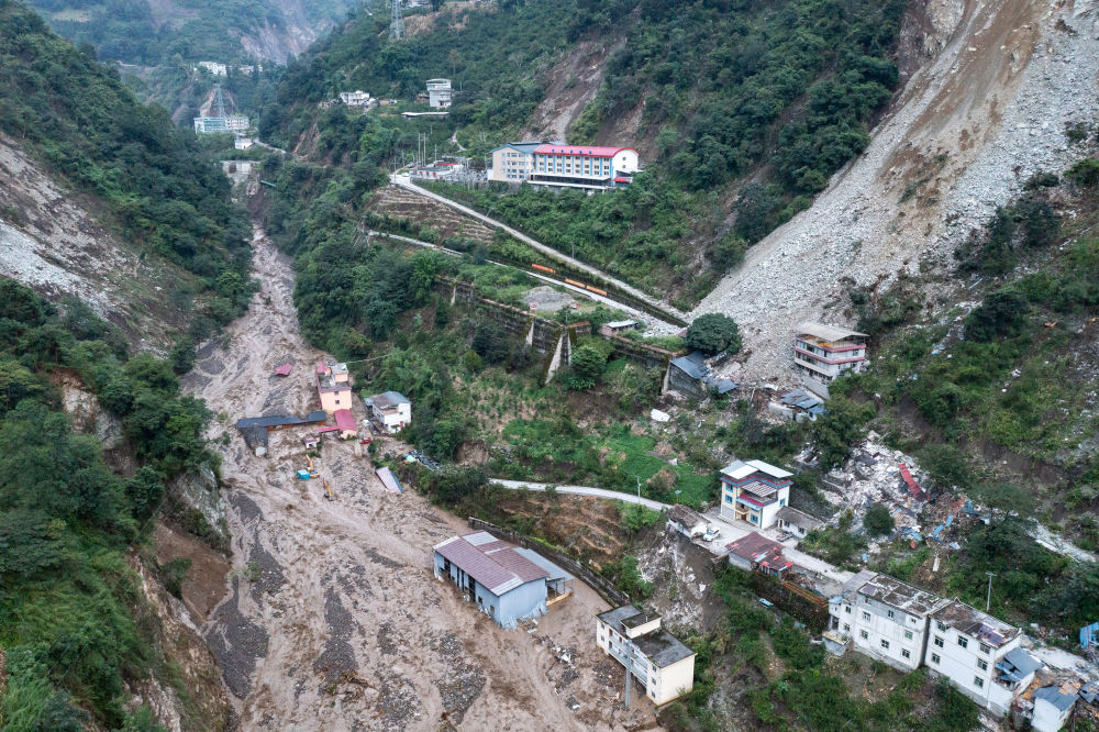 9月7日,在磨西鎮(zhèn)附近,四川路橋的工作人員在搶修通往海螺溝景區(qū)的道路(無人機照片)。