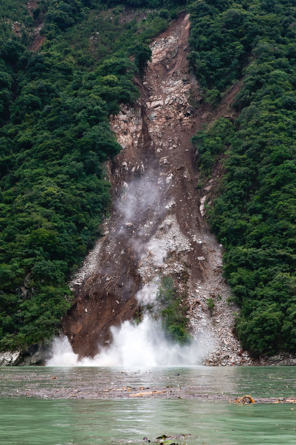 從聯(lián)合村隧道口下到山腳下,是一個臨時碼頭。因為地質、道路等條件所限,救援力量只能從這里乘坐橡皮艇,沿水路行至上圖那個山谷口附近,登陸后沿山路上行,翻過紅花崗再下行才能進入灣東村。坐在橡皮艇里,時不時還能看到河畔被地震破壞的山體仍在不停滾下落石,巨大的聲響回蕩在大渡河上空。