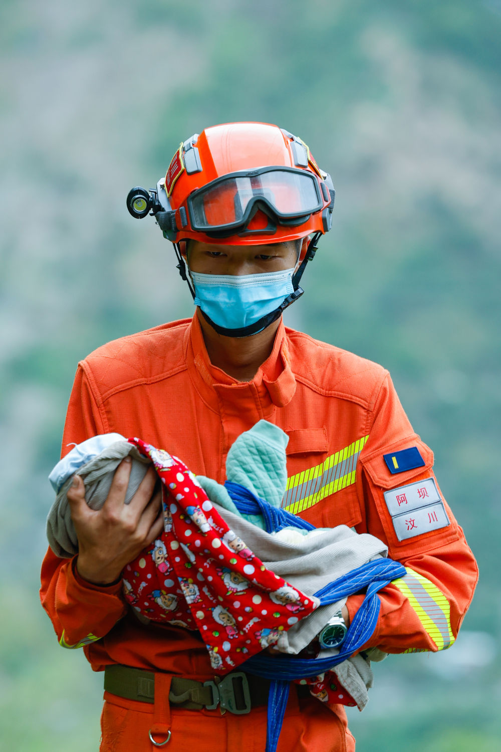 我一路小跑到消防員前面一段距離,拿起帶著長焦鏡頭的相機,蹲下,拍攝,再向前跑一段,再蹲下,再拍攝。經(jīng)歷了一天差不多10個小時的徒步、拍攝,此時我的體力確實有些跟不上,為了保證能把這個場景拍好,只能多拍一些,不留遺憾。消防員沿著土路折了幾道彎才走到聯(lián)合村隧道口的大路,把嬰兒交給值守在那里的瀘定縣人民醫(yī)院的醫(yī)護人員。此時我才有時間和他簡單聊了聊。他叫張自立,來自阿壩森林消防支隊汶川大隊,2個月大的嬰兒來自重災區(qū)灣東村。經(jīng)過包括新華社、人民日報、央視等媒體對這張照片的傳播,他第二天就成了大家口中的“汶川哥哥”。