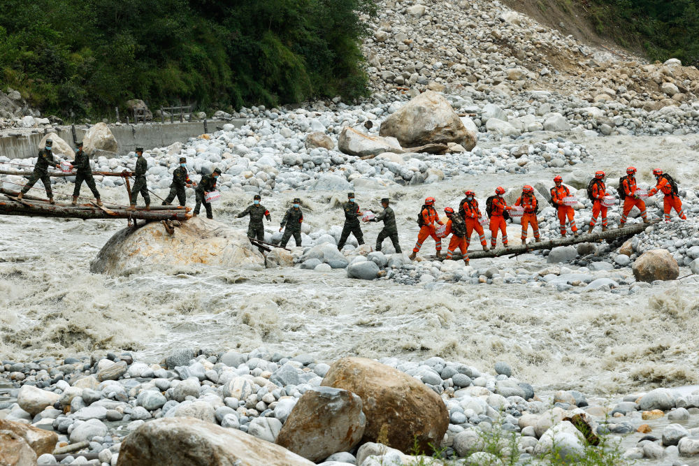 9月8日,在磨西鎮(zhèn)附近,救援人員站在臨時架設的小橋上向河對岸的村民運送生活物資。