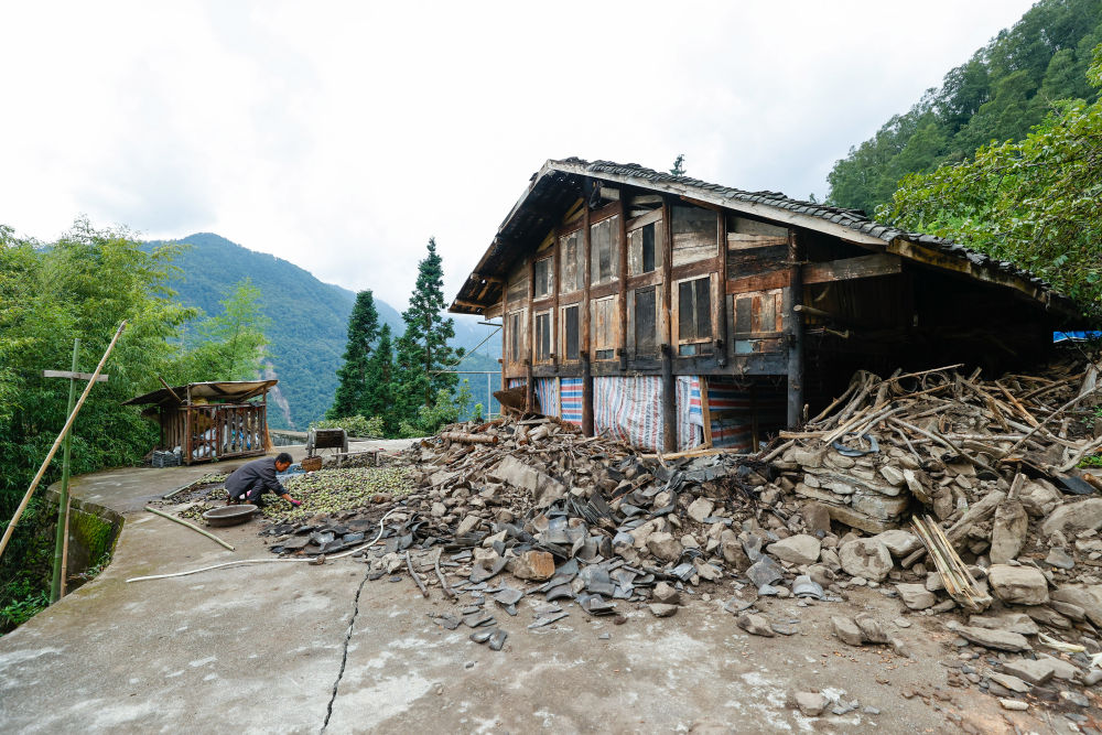 9月8日,共和村一組被地震損壞的民房。旁邊坍塌的山體本是盤山公路,如今已隱入山中不復存在。