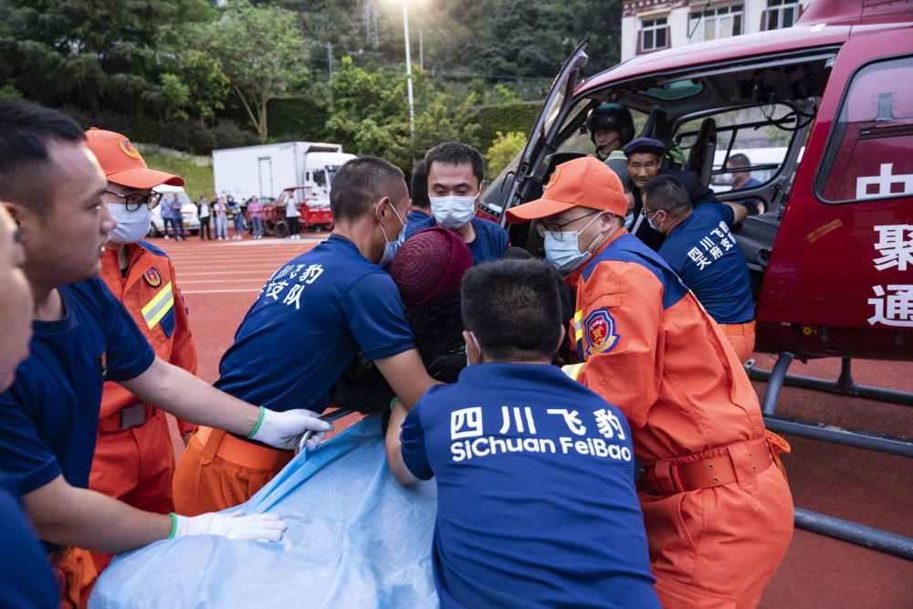 9月6日,在石棉縣中學的臨時起降點,救援人員在運送一名從石棉縣幸福村轉運來的受傷老人。