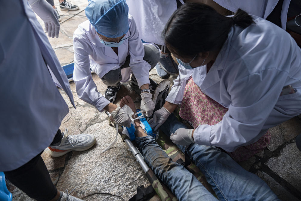 9月6日,在磨西鎮(zhèn)海螺溝廣場受災群眾臨時安置點,醫(yī)護人員為傷員包扎。
