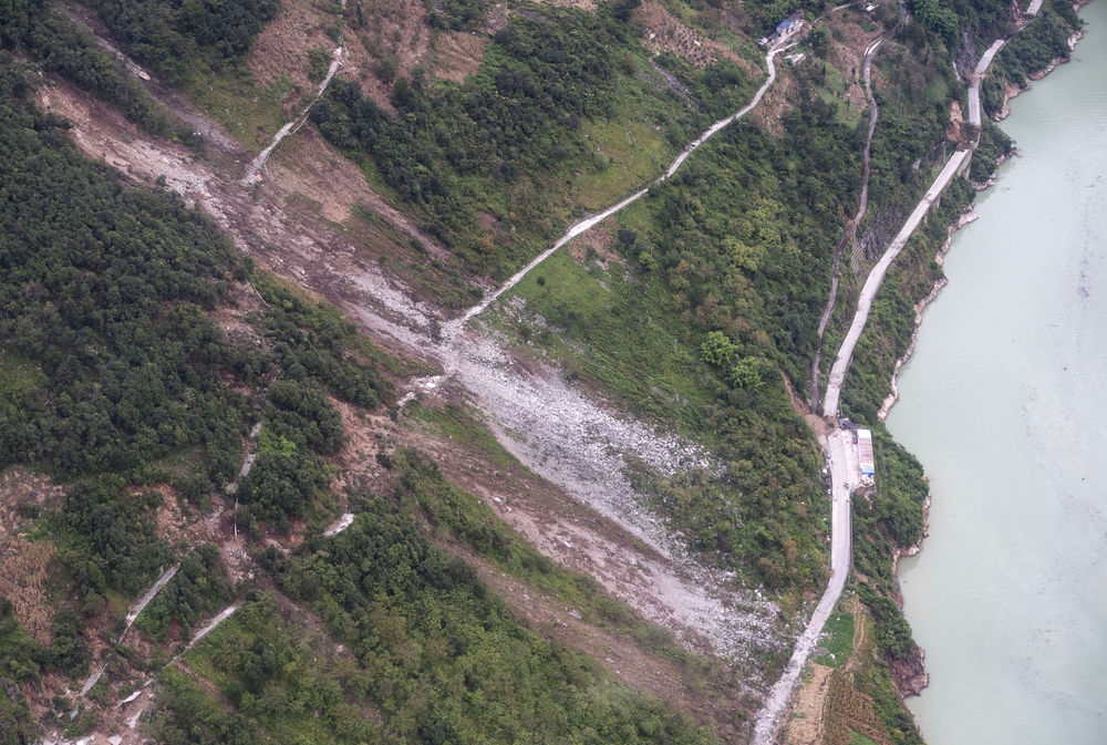 9月8日,在去往共和村的路上拍攝的盤山路塌下來形成的塌方。