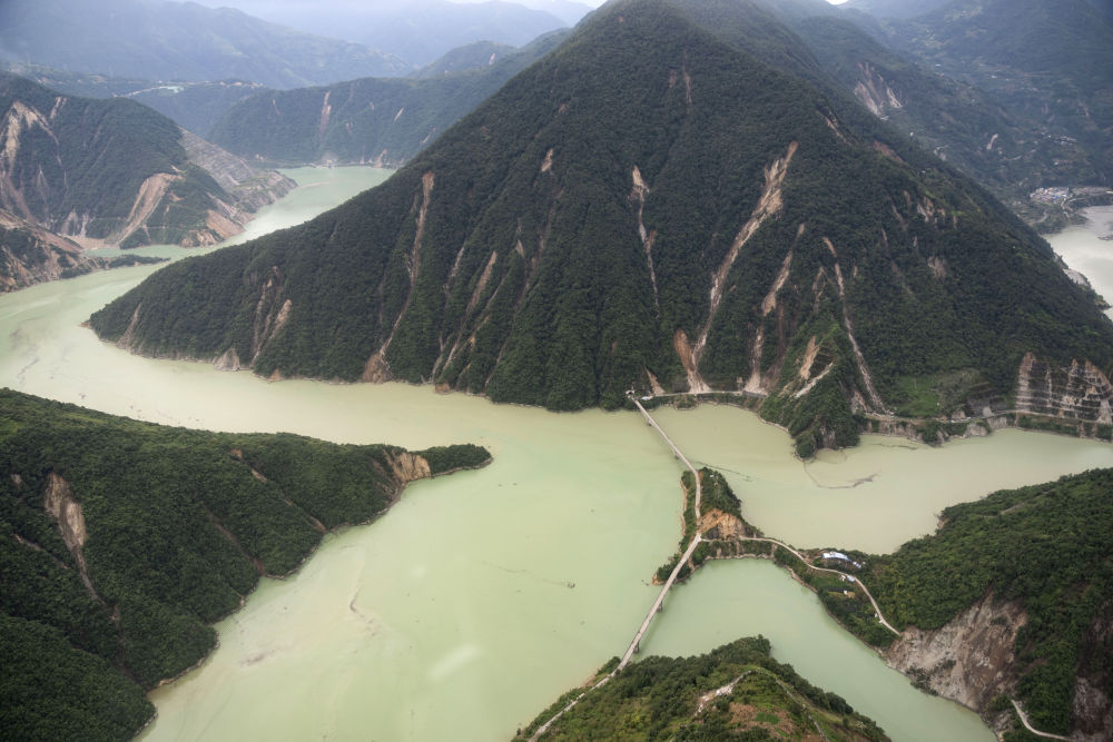 這是9月7日拍攝的幸福村二組附近的照片,可看到山體多處滑坡(無人機照片)。