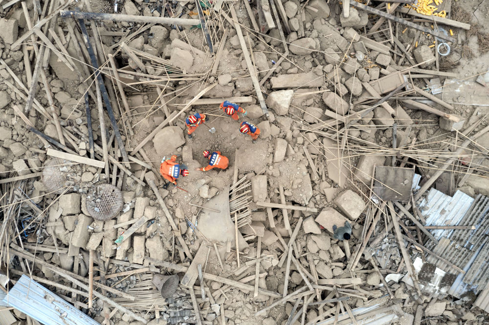 9月7日,在幸福村二組,四川眉山消防救援隊隊員幫助村民在倒塌的房屋中找尋物品(無人機照片)。