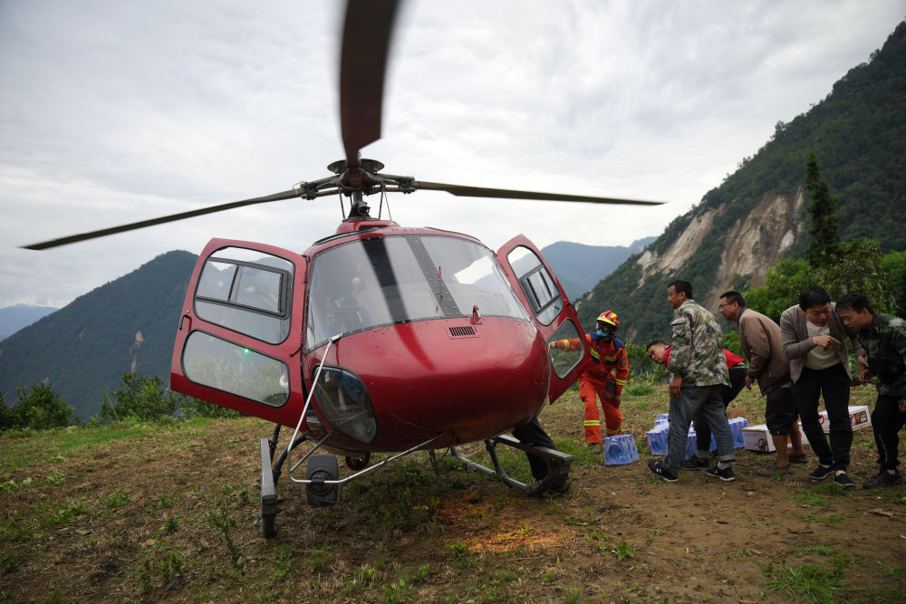 9月7日,在幸福村二組,村民與消防救援隊員搬運直升機送來的水和食物。
