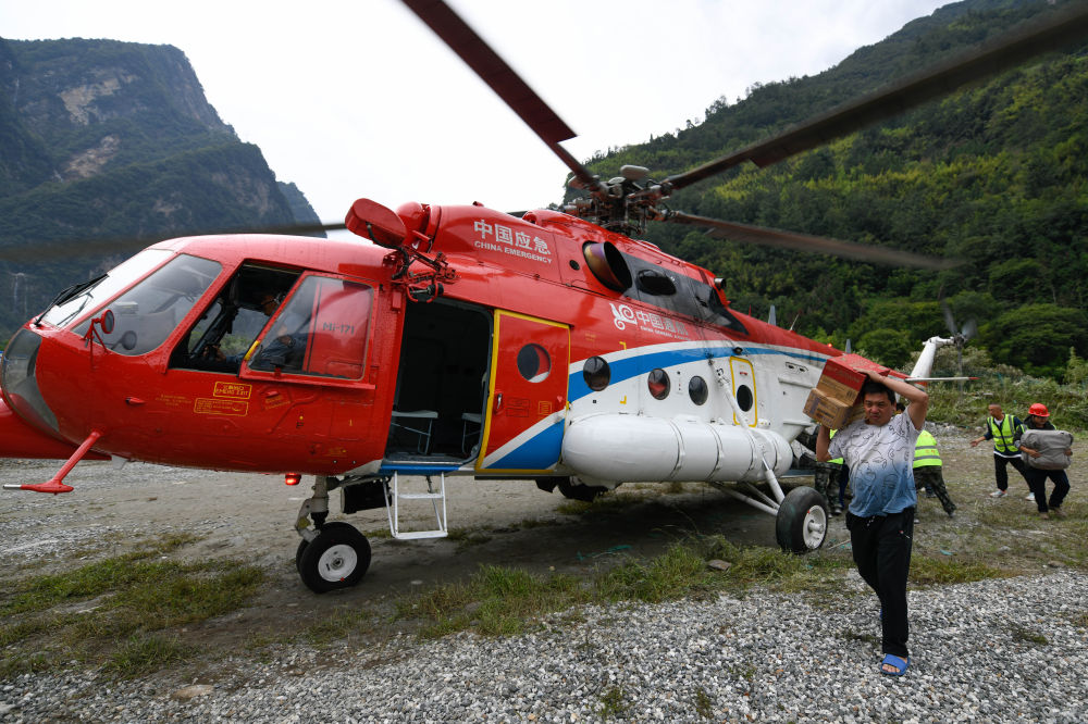 9月7日,搭載方便面和帳篷等救援物資的直升機抵達石棉縣草科鄉(xiāng),當?shù)厝罕姲徇\物資。