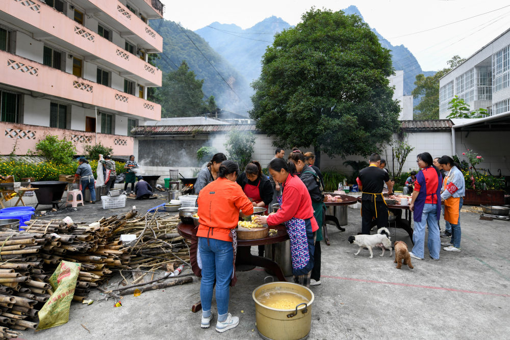 9月7日,在草科鄉(xiāng)政府安置點內,當?shù)厝罕姙樵趫鼍仍藛T準備飯菜。