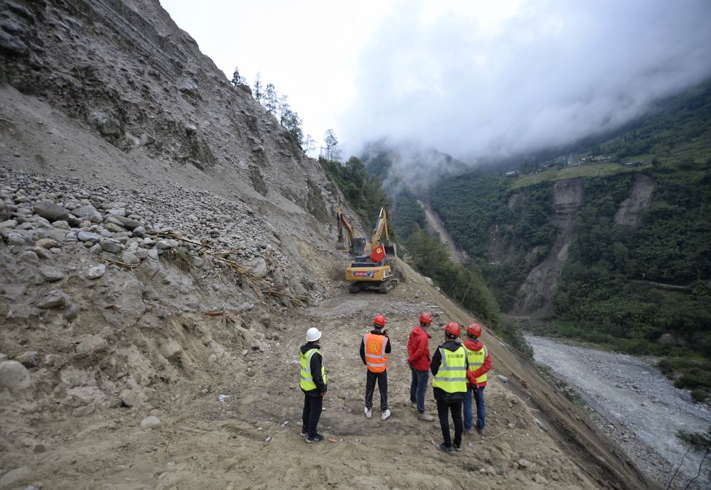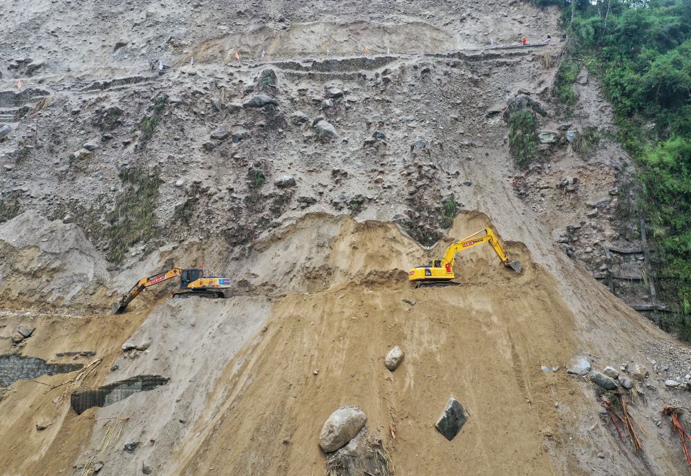9月9日,搶險人員在搶通磨西鎮(zhèn)附近道路。