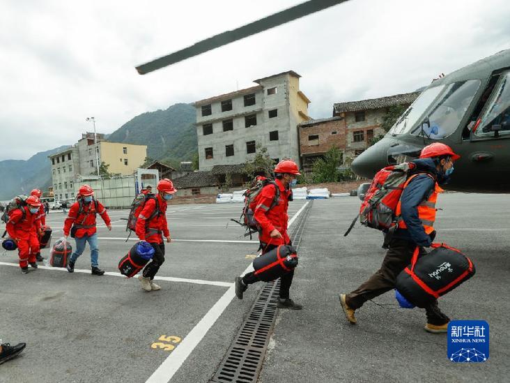 9月7日,在四川省甘孜州瀘定縣磨西鎮(zhèn),四川省冶勘設(shè)計集團有限公司的6名調(diào)查隊員攜帶裝備搭乘直升機前往海螺溝景區(qū)開展地質(zhì)災(zāi)害應(yīng)急排查工作。新華社記者 沈伯韓 攝