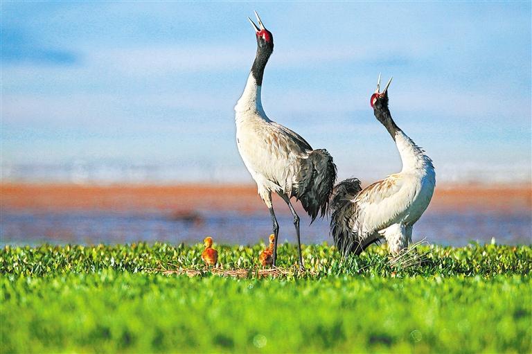 棲息在碌曲尕海濕地的國(guó)家一級(jí)保護(hù)動(dòng)物黑頸鶴。新甘肅·甘肅日?qǐng)?bào)通訊員 張勇