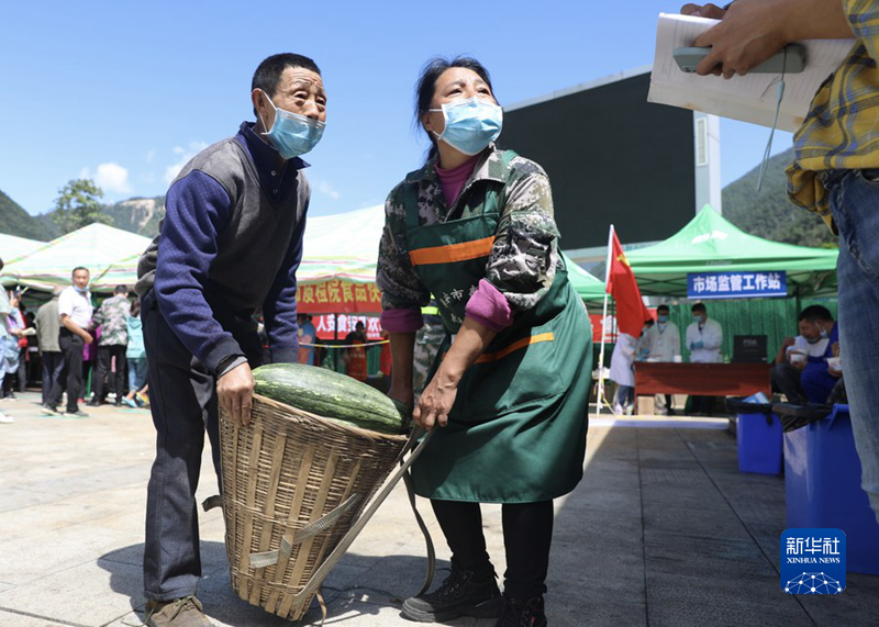 9月10日,在四川省石棉縣王崗坪鄉(xiāng)安置點(diǎn)內(nèi),謝欽明(左)為安置點(diǎn)送來南瓜。新華社記者 劉瓊 攝