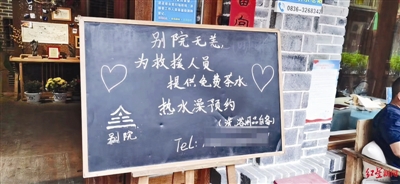 “古道別院”工作人員唐莎告訴記者,地震發(fā)生后,民宿就把客房提供給了救援人員住宿,也提供免費茶水、咖啡,同時給救援人員和當(dāng)?shù)鼐用裉峁┫丛璧牡胤健?/p>