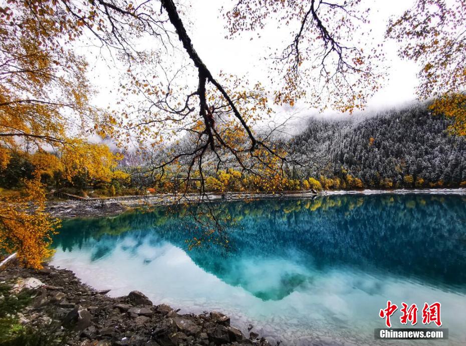 十月,九寨溝長海、原始森林等景點迎來入秋后的第一場雪。澄凈碧藍的海子和金色的彩林與潔白的雪花相映相襯,構成一幅靜謐的美麗畫卷。遠遠看去,成片的彩林被一朵朵雪花點綴,美得像童話世界一般。 梁峰 攝