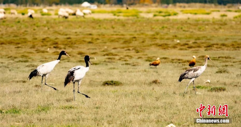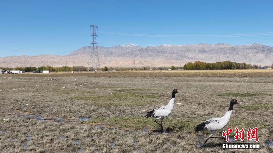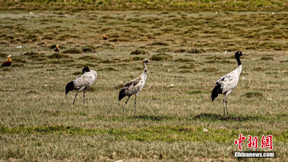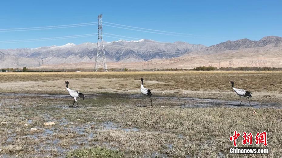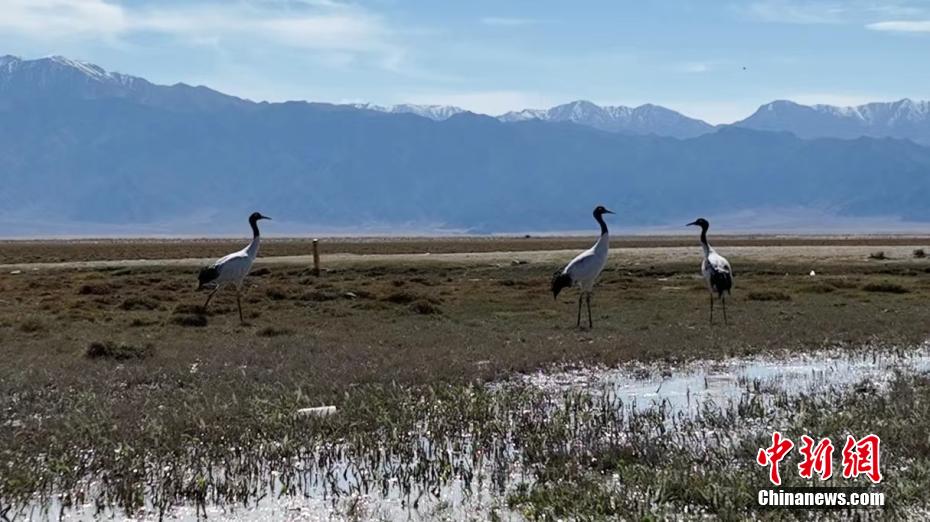 圖為黑頸鶴群踏著黑色細長的腿閑庭信步。 烏蘭縣融媒體中心 供圖