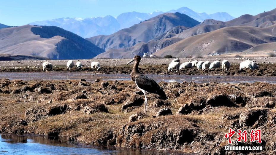 高原深秋,在祁連山國家公園青海片區(qū)的祁連縣阿柔鄉(xiāng)的一片沼澤地,攝影師拍到了一只成年黑鸛。畫面中,黑鸛在祁連縣阿柔鄉(xiāng)的一片沼澤地里覓食休憩,時(shí)而在羊群牛群中飛翔穿梭,仿佛在幫牧人“放牧”。包雷 攝