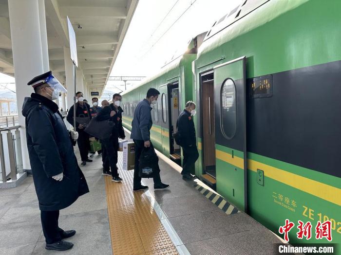 為搬遷民眾排隊(duì)乘車。蘭州鐵路局供圖