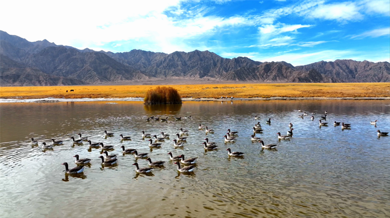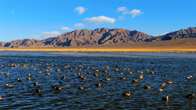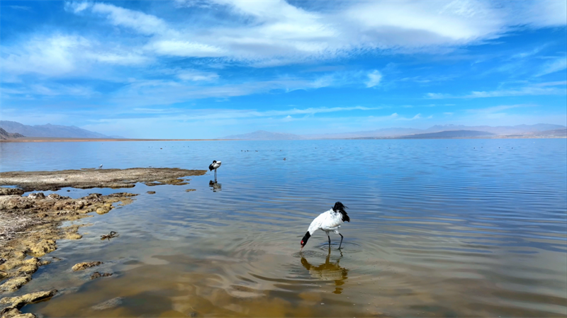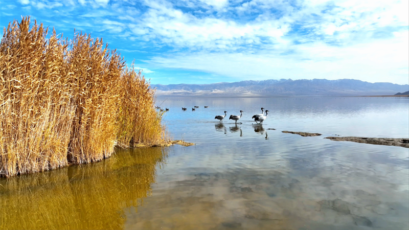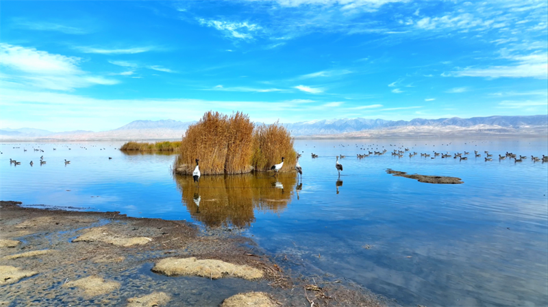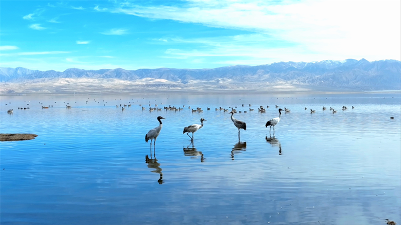 初冬時(shí)節(jié),在青海省海西蒙古族藏族自治州烏蘭縣都蘭湖國家濕地公園內(nèi),四只國家一級保護(hù)動物黑頸鶴,踏著黑色細(xì)長的腿在湖中閑庭信步,與斑頭雁、赤麻鴨一起嬉戲覓食,盡顯柴達(dá)木盆地濕地生態(tài)之美。