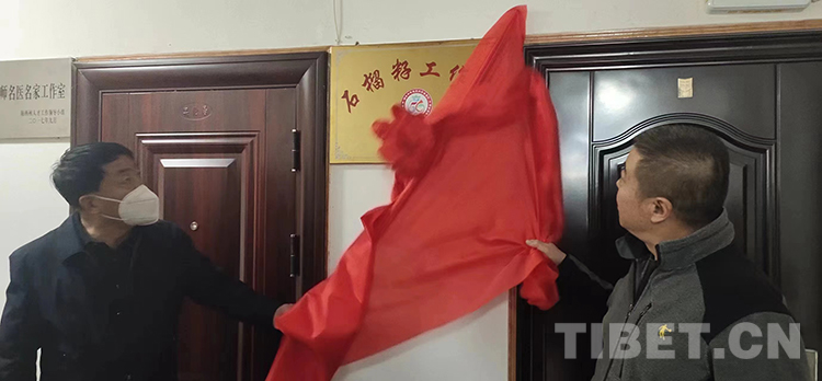 圖為海西州政協(xié)副主席張亞邦(右),州委統(tǒng)戰(zhàn)部副部長(zhǎng)、州民宗委主任張啟忠(左)為工作室揭牌 攝影:東主才讓