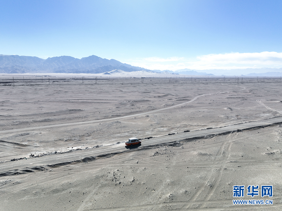 2月5日,青藏集團有限公司西寧供電段格爾木檢修車間工長王永忠與同事駕車前往變電所進行巡檢(無人機照片)。新華社記者 張龍 攝