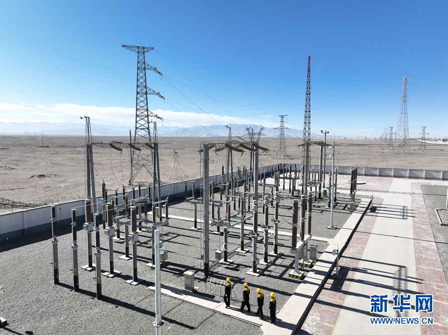 2月5日,在青藏集團有限公司西寧供電段格爾木南變電所,王永忠(左一)與同事們在巡檢(無人機照片)。新華社記者 張龍 攝