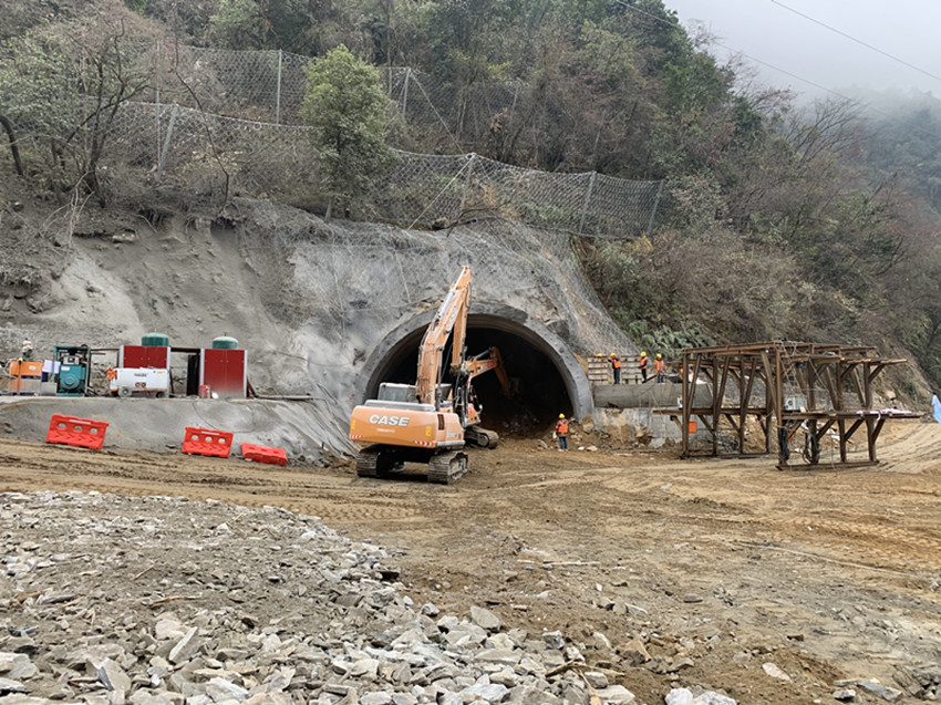 圖為海螺溝景區(qū)道路(磨西鎮(zhèn)至三號營地)共和2號隧道出口正在施工。