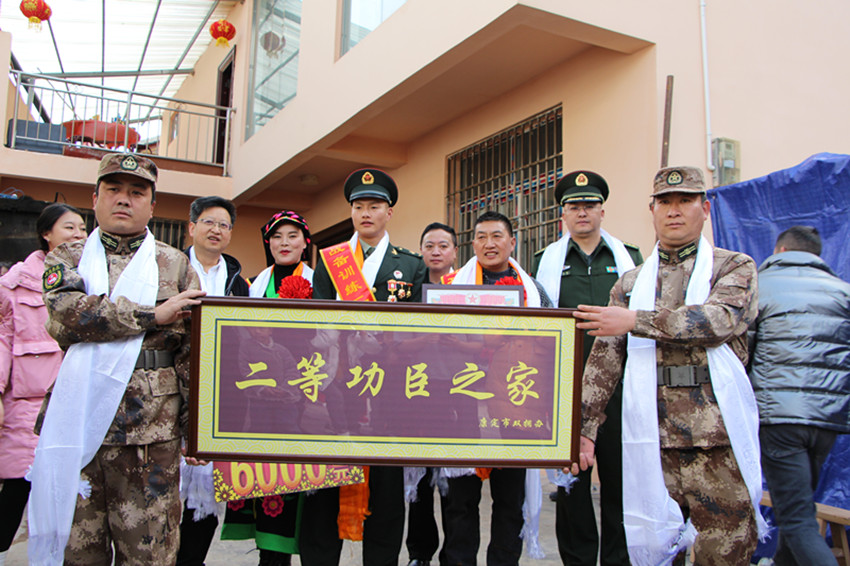 鑼鼓喧天,喜氣洋洋。2月9日,康定市姑咱鎮(zhèn)浸水村敲鑼打鼓迎接回鄉(xiāng)的王昊??刀ㄊ腥嗣裾⒖刀ㄊ腥宋洳亢屯艘圮娙耸聞站譃橥蹶患凹胰伺暇R帶、戴好紅花,鄭重地將喜報、慰問金和“二等功臣之家”的牌匾送到他們手中。看著手中沉甸甸的榮譽,王昊和父母的喜悅之情溢于言表。