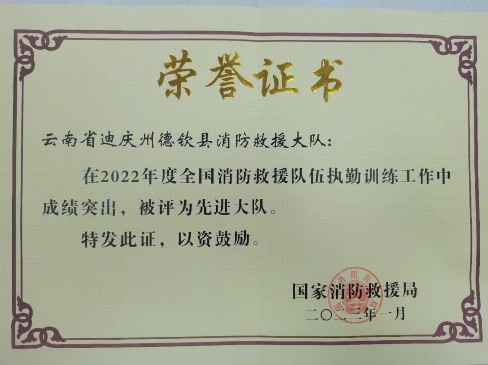 日前,國家消防救援局印發(fā)《關(guān)于表彰2022年度執(zhí)勤訓(xùn)練工作先進(jìn)單位和個人的通報(bào)》,德欽縣消防救援大隊(duì)被表彰為2022年度全國消防救援隊(duì)伍執(zhí)勤訓(xùn)練工作先進(jìn)大隊(duì)。