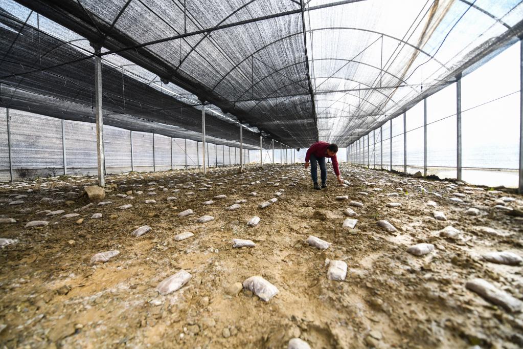 2月9日,克枯村村民余祥在大棚里查看羊肚菌的長(zhǎng)勢(shì)。新華社記者 王曦 攝
