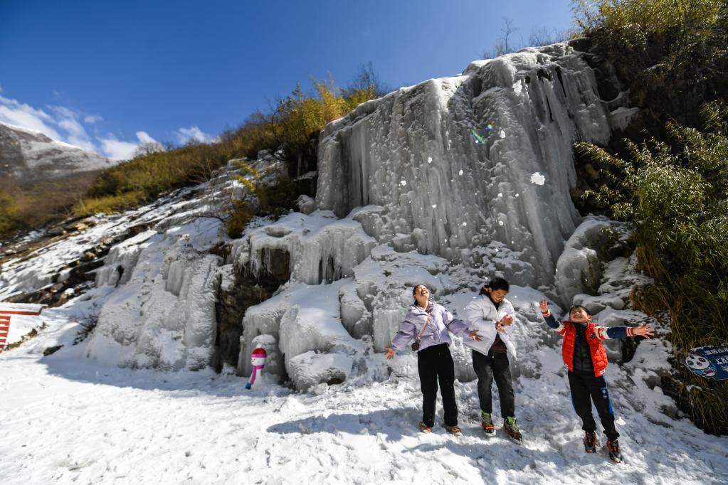 2月9日,來(lái)自成都的游客在克枯村的冰瀑下玩雪。新華社記者 王曦 攝