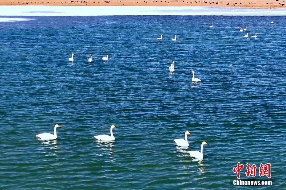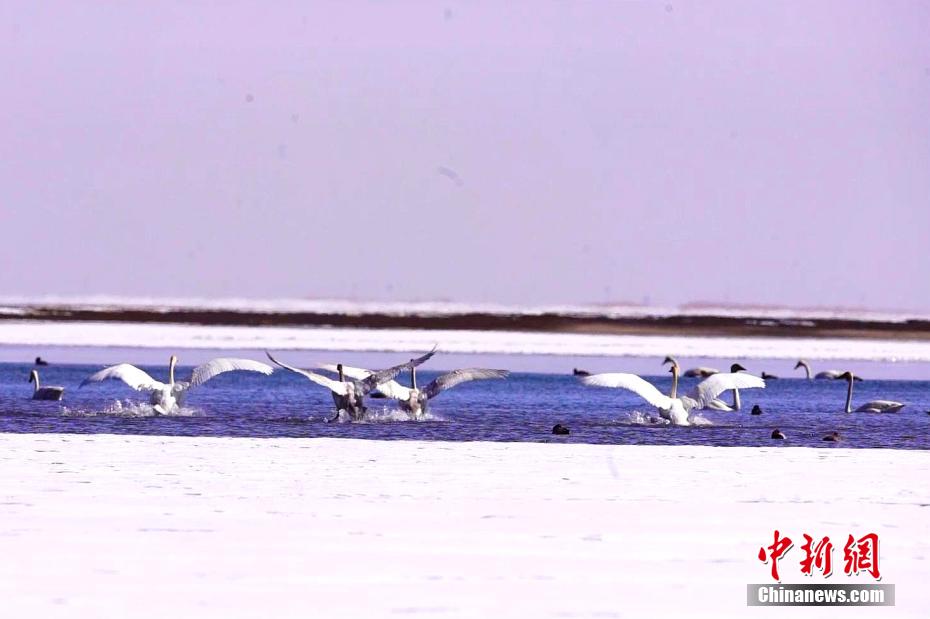 高原初春,在素有“高原藍(lán)寶石”之稱的青海湖,記者拍攝到成群大天鵝在湖面上練習(xí)起飛、降落、滑行。青海國家公園觀鳥協(xié)會會長王艦艇介紹,每年3月中旬,在青海越冬的大天鵝都會踏上北遷繁殖路。目前在青海湖的大天鵝多為青海東部黃河流域的“冬候鳥”,在青海湖短暫停留后北遷到夏季繁殖地,在秋末初冬時又會“舉家”回歸來到越冬地。大天鵝屬雁形目鴨科天鵝屬,為國家二級重點保護(hù)野生動物,在國內(nèi)主要繁殖于新疆巴音布魯克,主要越冬地有天津及河北沿海、山東榮成和東營、黃河中下游濕地、甘肅、青海、新疆等地。青海湖作為大天鵝的主要越冬地之一,開闊的湖面、涌流的泉水與充足的食物為大天鵝提供了適宜的棲息環(huán)境。