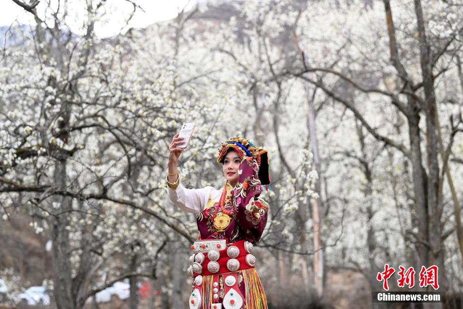 圖為藏族姑娘在梨花林里拍照。安源 攝
