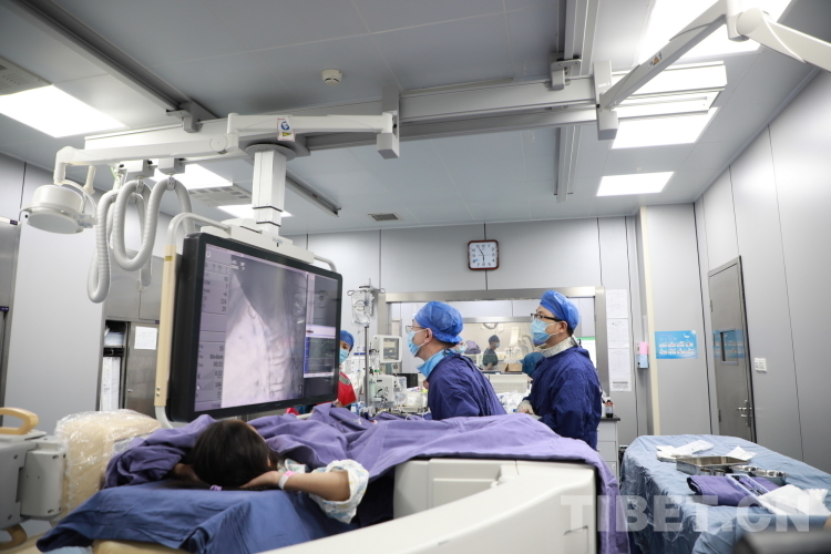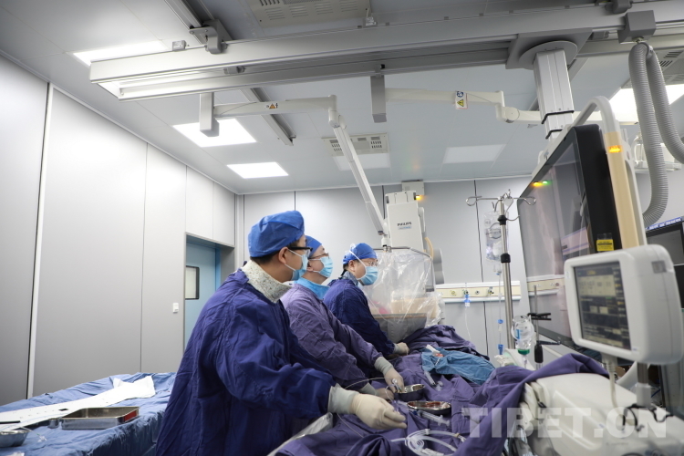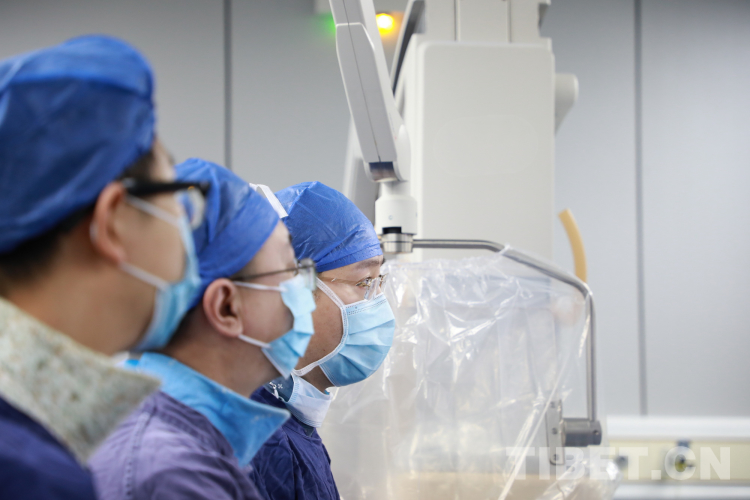 圖為北醫(yī)三院院長助理唐熠達(dá)教授(右一)帶領(lǐng)專家團(tuán)隊(duì)在為來自青海省果洛藏族自治州的先心病患兒手術(shù)時(shí)觀察導(dǎo)管行進(jìn)情況 攝影:劉莉