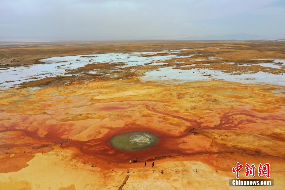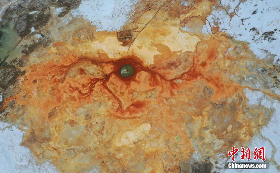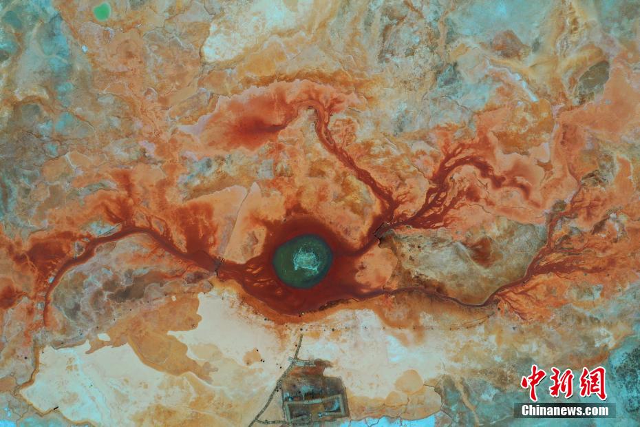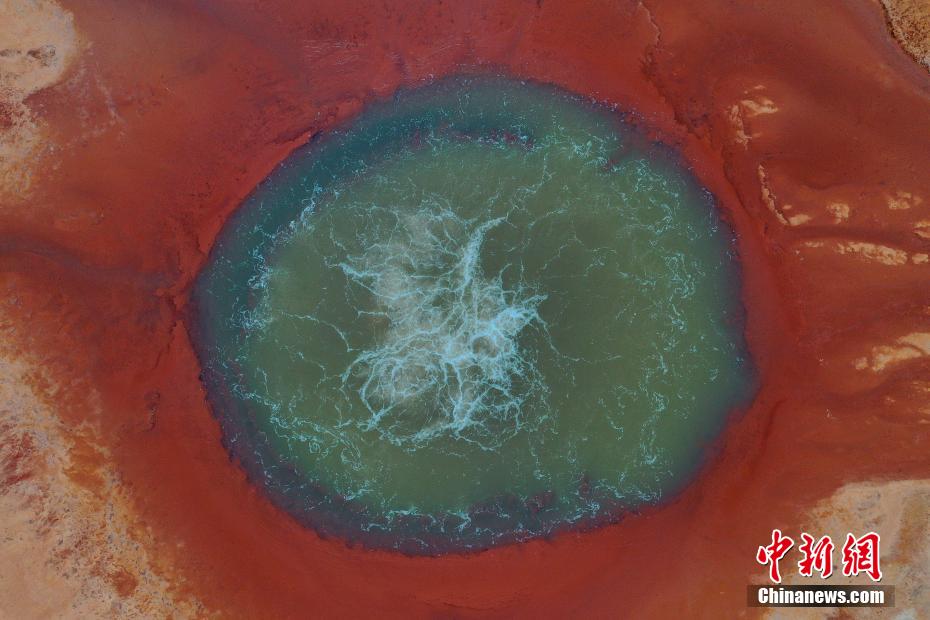 艾肯泉位于青海省海西蒙古族藏族自治州茫崖市花土溝鎮(zhèn)。艾肯”蒙語意為“可怕”,由于含硫量過高,泉眼周圍飛鳥野獸不敢靠近,泉水流經的地方寸草不生。從空中俯瞰,泉眼與噴涌出的泉水及周圍土地上深紅色環(huán)帶狀的沉淀物,組成了一個奇特的瞳孔造型,仿佛一只鑲嵌在大地上的眼睛,因此被稱為“惡魔之眼”。圖為航拍茫崖市艾肯泉。