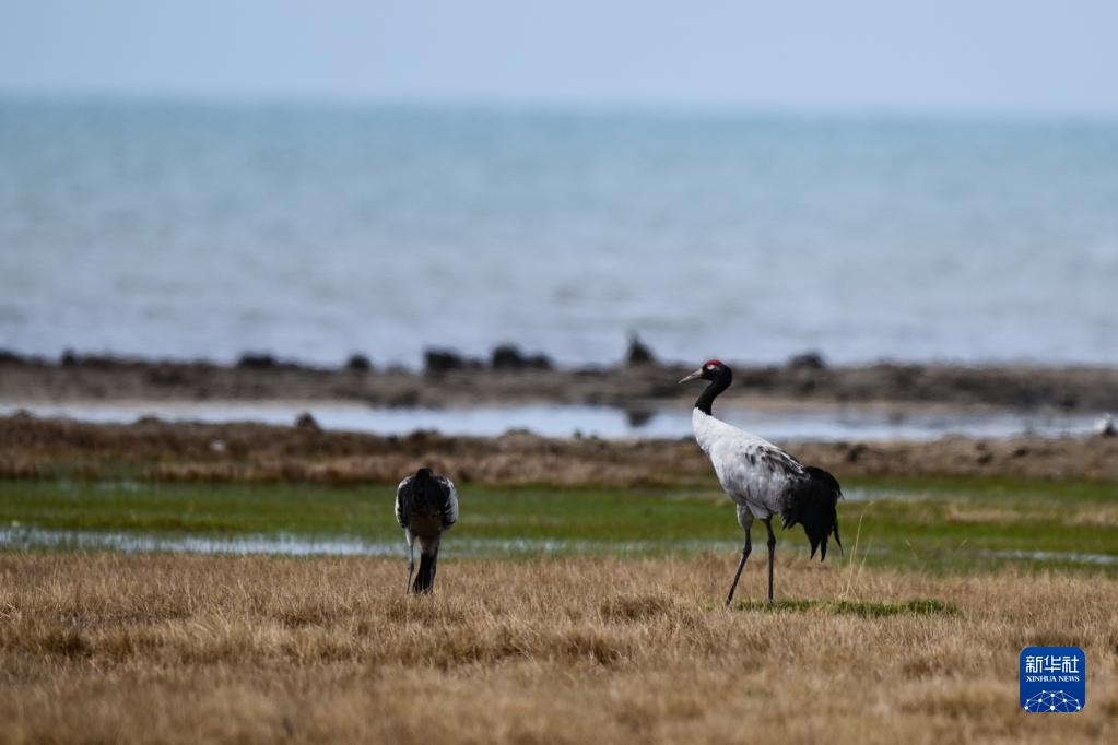 這是5月17日在青海省海北藏族自治州剛察縣境內(nèi)的青海湖仙女灣景區(qū)拍攝的黑頸鶴。新華社記者 解統(tǒng)強 攝