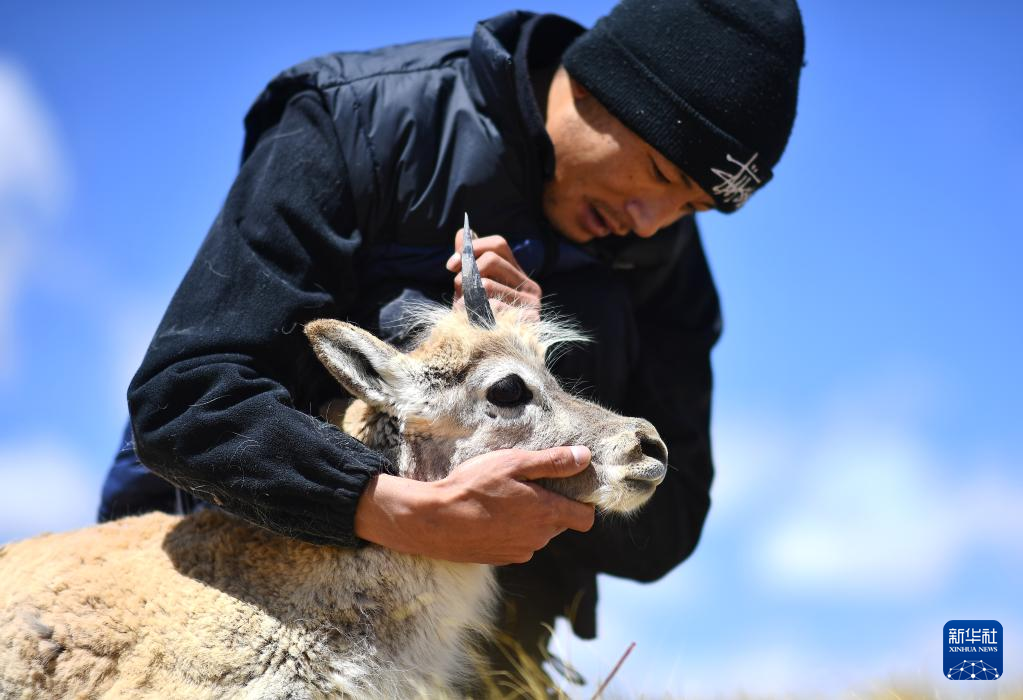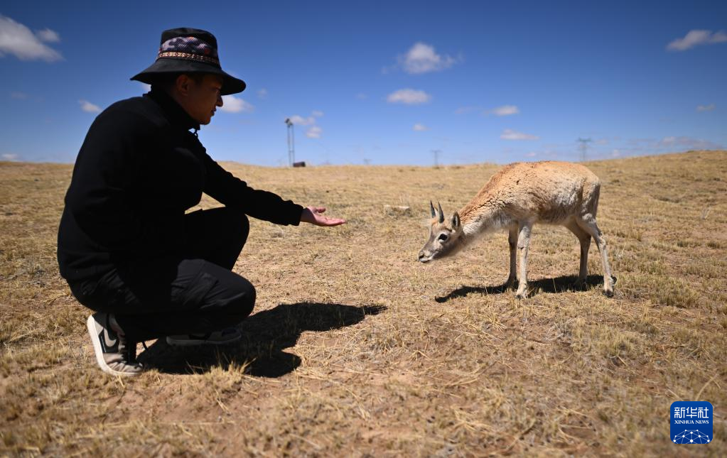 在可可西里國(guó)家級(jí)自然保護(hù)區(qū)索南達(dá)杰保護(hù)站,巡山隊(duì)員扎西桑周在野生動(dòng)物救助中心內(nèi)與一只被救助的小藏羚羊互動(dòng)(5月30日攝)。 新華社記者 張宏祥 攝