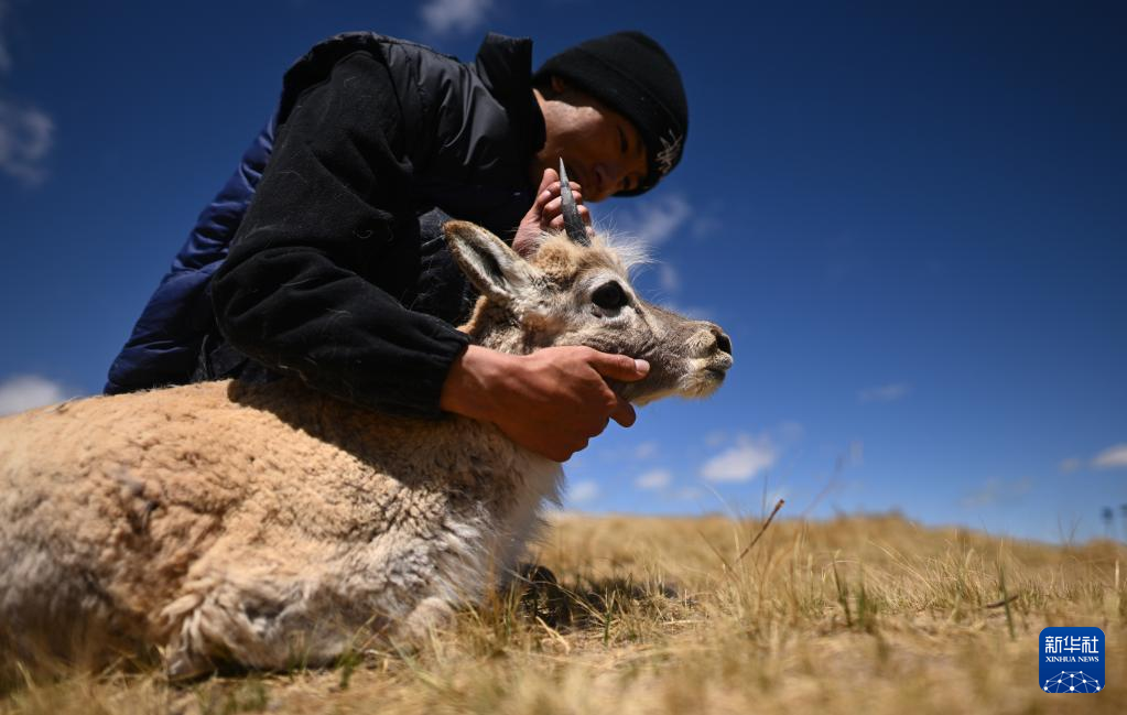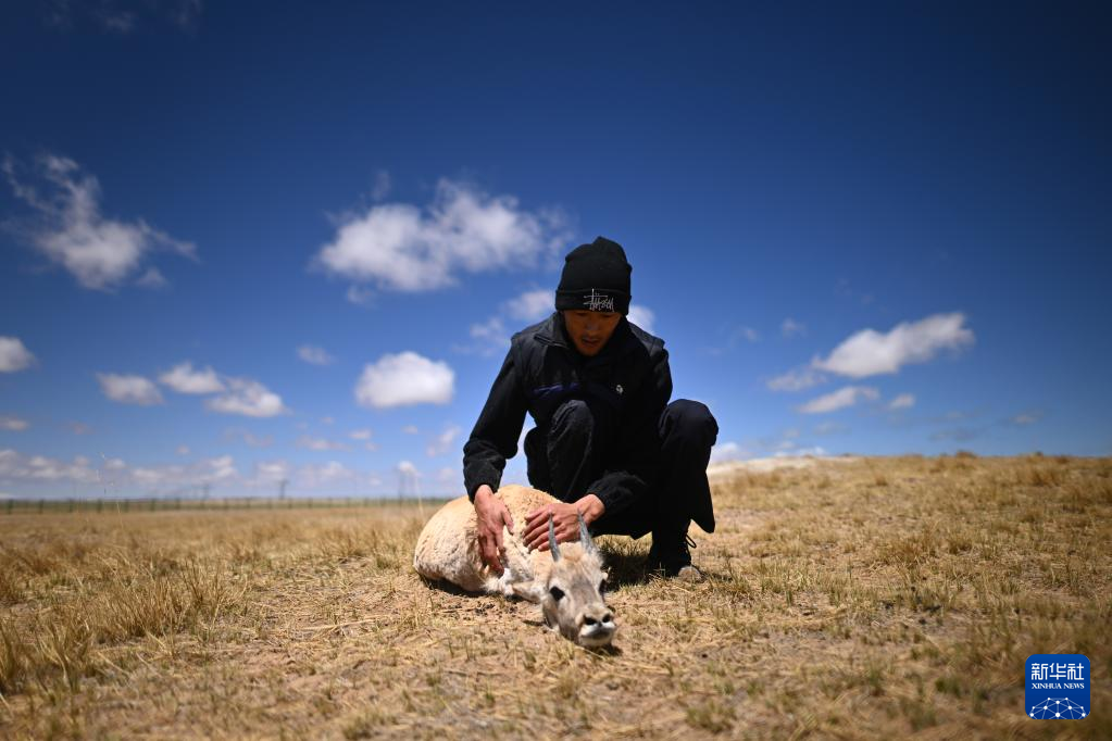 在可可西里國(guó)家級(jí)自然保護(hù)區(qū)索南達(dá)杰保護(hù)站,巡山隊(duì)員才文多杰在野生動(dòng)物救助中心查看被救助的藏羚羊身體狀況(5月30日攝)?!⌒氯A社記者 張宏祥 攝