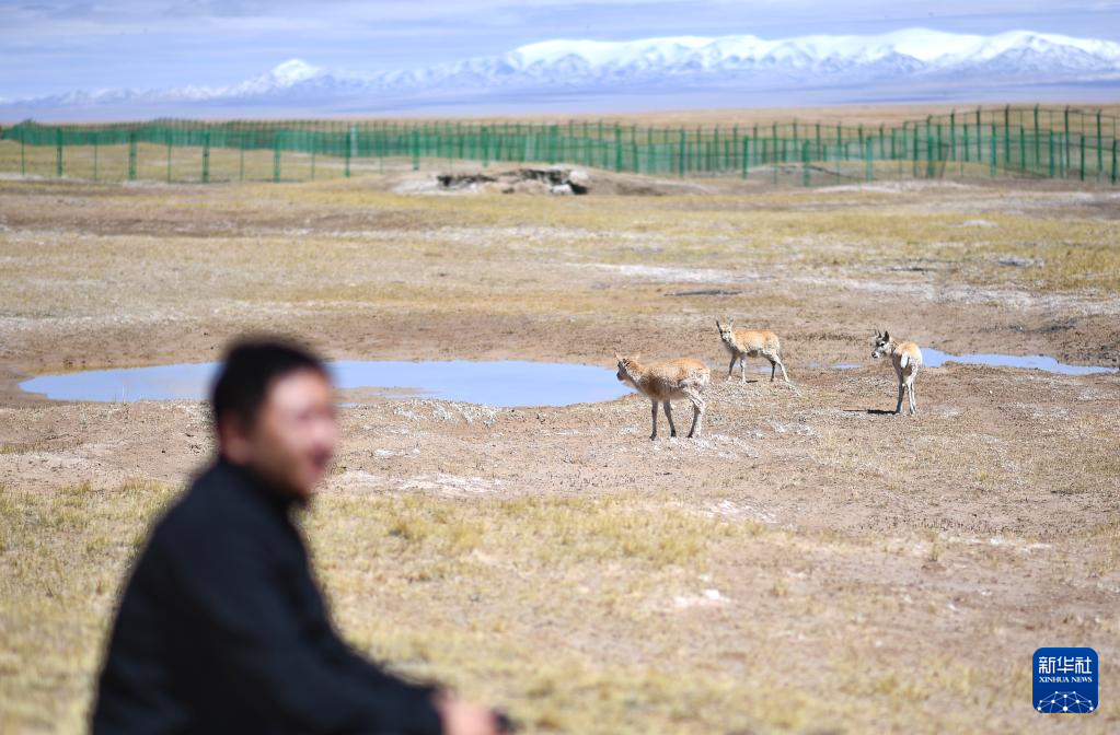 5月30日,在可可西里國(guó)家級(jí)自然保護(hù)區(qū)索南達(dá)杰保護(hù)站,巡山隊(duì)員才文多杰和藏羚羊在一起。 新華社記者 薛玉斌 攝