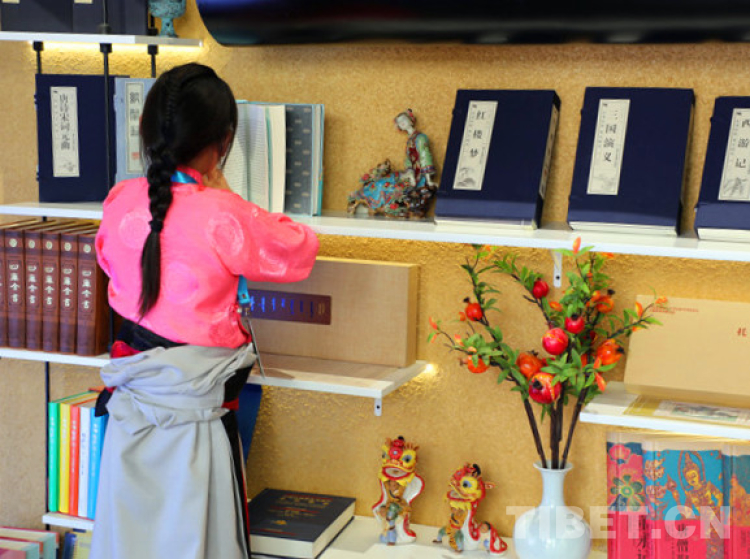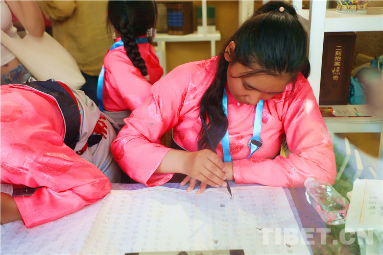 當(dāng)穿著藏裝的姑娘走過書架,翻開四大名著,努力讀出上面的文字,在古香古色的書桌前,幾個(gè)姑娘爭(zhēng)先用毛筆描繪著宣紙上的小楷,那畫面美得像一幅幅仕女畫。