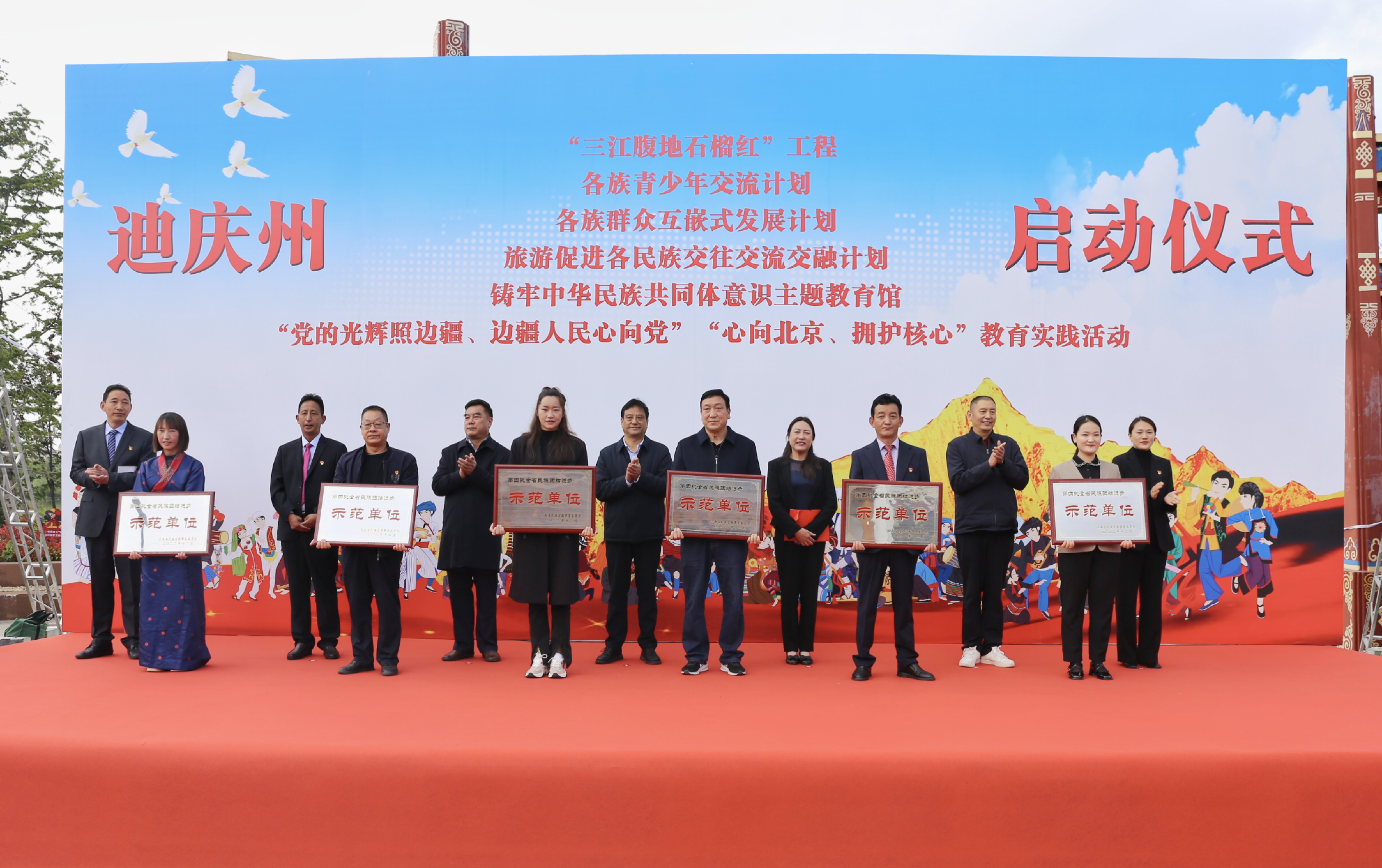 啟動儀式上,迪慶紅軍長征博物館被授予“云南省鑄牢中華民族共同體意識教育實踐基地”牌匾,并向2022年榮獲“云南省民族團結進步示范單位”的代表授牌。