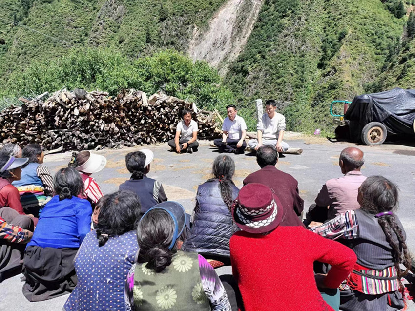 圖為絨壩鄉(xiāng)干部向群眾宣傳防汛知識。