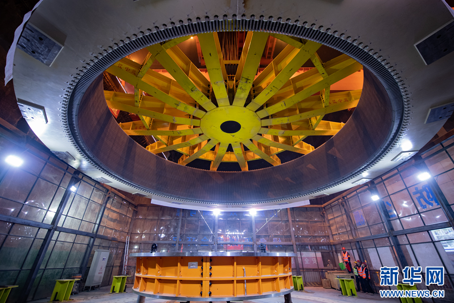 6月30日,瑪爾擋水電站地下廠房?jī)?nèi),工作人員正在進(jìn)行首臺(tái)機(jī)組定子吊裝作業(yè)。新華網(wǎng) 潘彬彬 攝