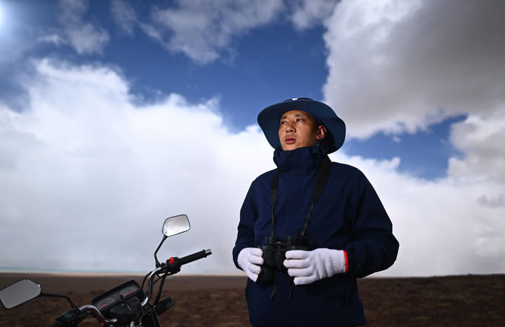 可可西里管理處卓乃湖保護站巡山隊員尕瑪扎西在巡山途中(6月17日攝)。新華社記者 張宏祥 攝