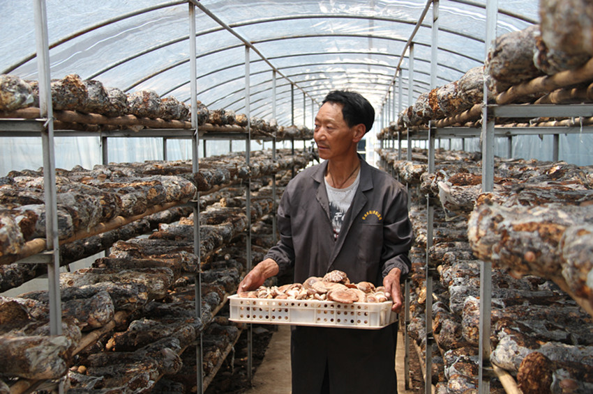 圖為當?shù)貏展と藛T正在采摘香菇。